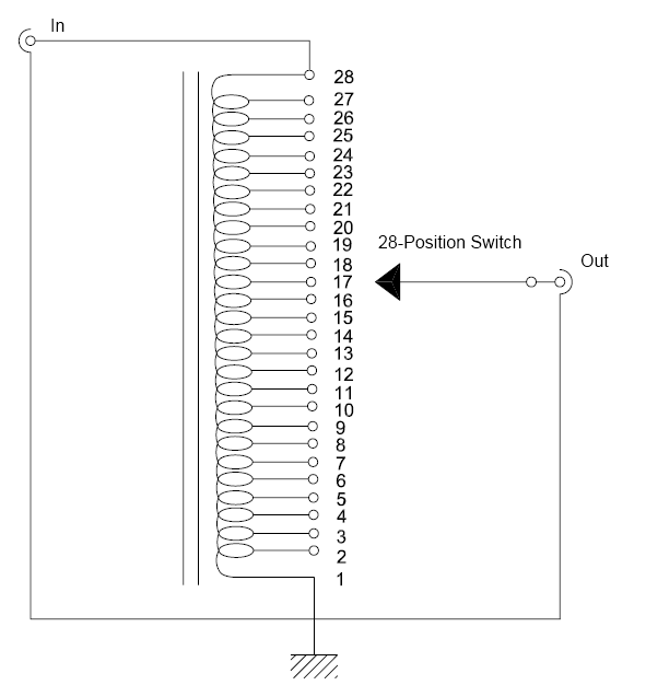 The single winding (output) winding offers a number of taps allowing the following attenuation values: