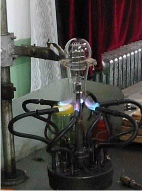 After parts are fitted, the bottom is heated and shaped for insertion of inner glass component that the leads feed from.